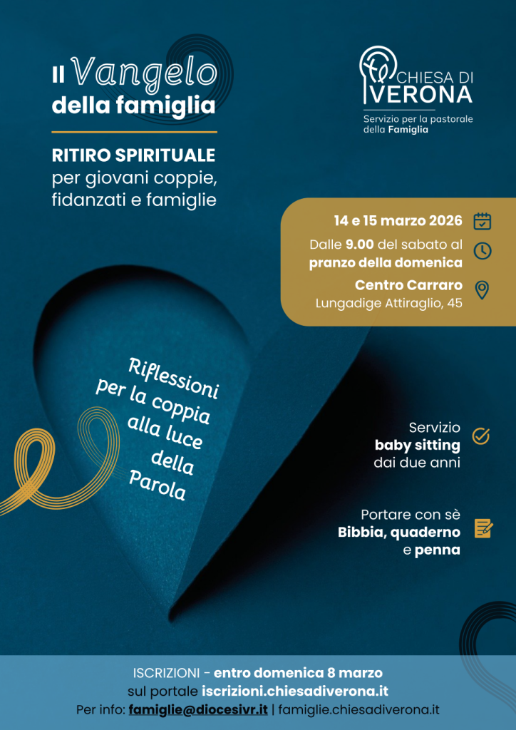 Il Servizio per la Pastorale della Famiglia della Chiesa di Verona propone un ritiro spirituale dedicato a giovani coppie, fidanzati e famiglie che desiderano rileggere la propria vita e la propria relazione alla luce della Parola di Dio. Un fine settimana per prendersi cura della coppia e vivere momenti di confronto e preghiera.