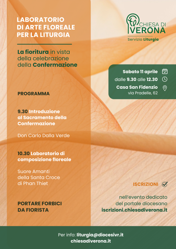 Sabato 11 aprile dalle 9.30 alle 12.30 presso la Casa di spiritualità di San Fidenzio, si terrà un corso rivolto ai fioristi e alle fioriste dei luoghi di culto, intitolato “La fioritura in vista della celebrazione della Confermazione”, organizzato dal Servizio liturgia della Diocesi di Verona.