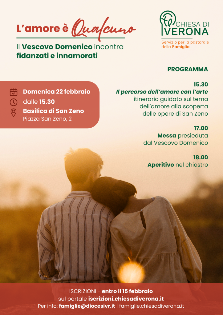 Per questo, il Servizio diocesano per la Pastorale della Famiglia propone l’incontro “L’amore è Qualcuno”, un pomeriggio dedicato a fidanzati e innamorati della Diocesi di Verona, con la presenza del Vescovo Domenico.